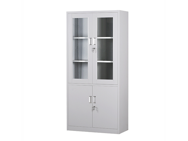 2.门板:上玻下实,上下均为双开门型式,柜体两片门间无中央垂直支柱阻挡;门板为双层结构,内外面均经环氧树脂粉末静电喷涂,夹层内具消音材料;门板配置门扣组及橡胶缓冲垫;